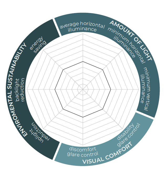 Grafen viser områdene og indikatorene som er definert av Energiavdelingen ved Politecnico di Torino for vurdering av ytelsen til et utendørs