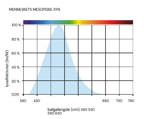 Den spektrale responsen for mesopisk syn har en bølgelengdetopp ved 507 nm (blågrønt).