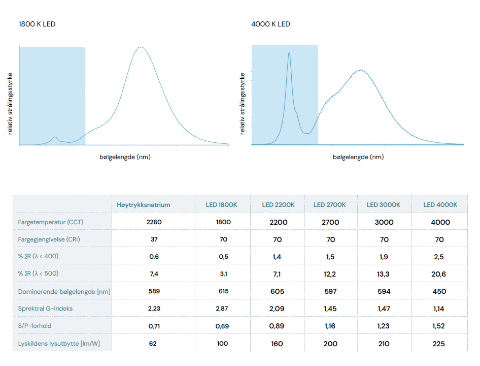 Utslipp i det blå og røde området kan også påvirke planter negativt ved å forlenge fotosyntesen om natten og endre vekstmønster.